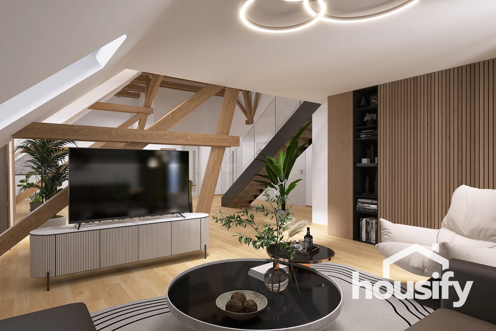 Hlavní obytná část o rozloze 77 m² spojuje otevřený mezonet, obývací pokoj a kuchyňský kout. Výjimečnou atmosféru tohoto prostoru vytváří kombinace minimalistických detailů, industriálního kovového schodiště a hřejivosti přírodních materiálů, jako jsou dřevěné trámy. Pečlivé propojení těchto prvků dodává interiéru nezaměnitelný charakter. Další komfort zajistí tři samostatné ložnice a dvě koupelny s toaletou.
