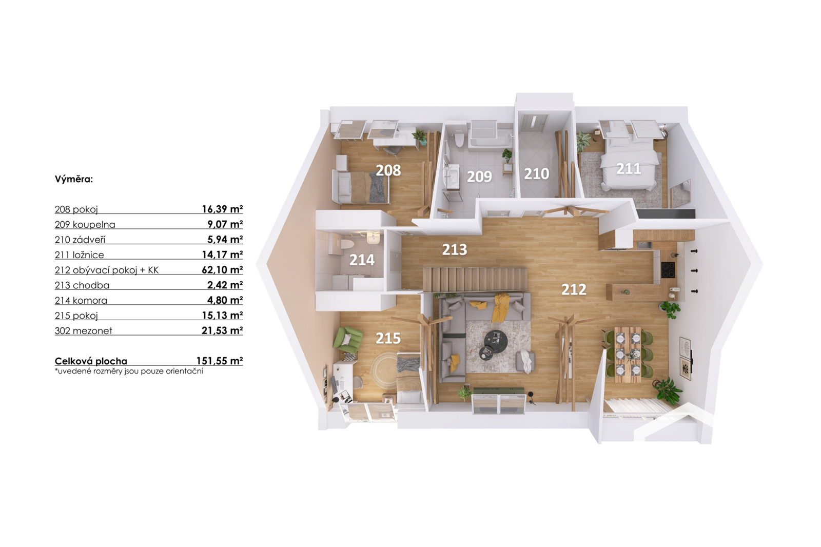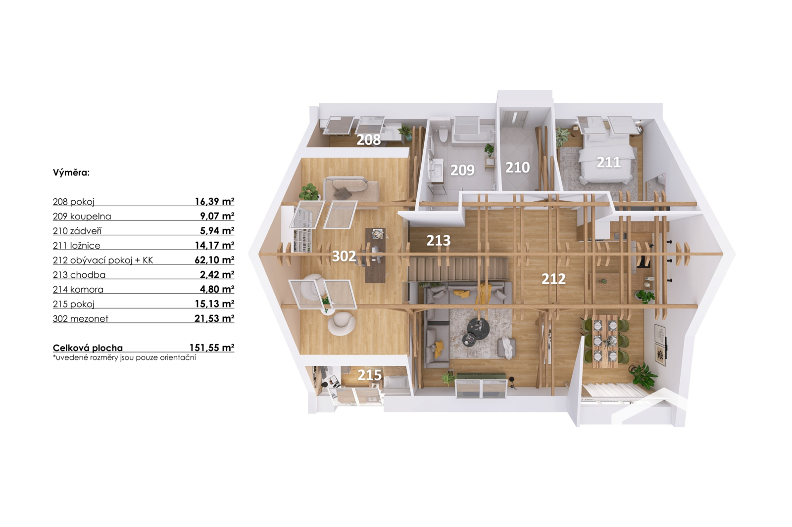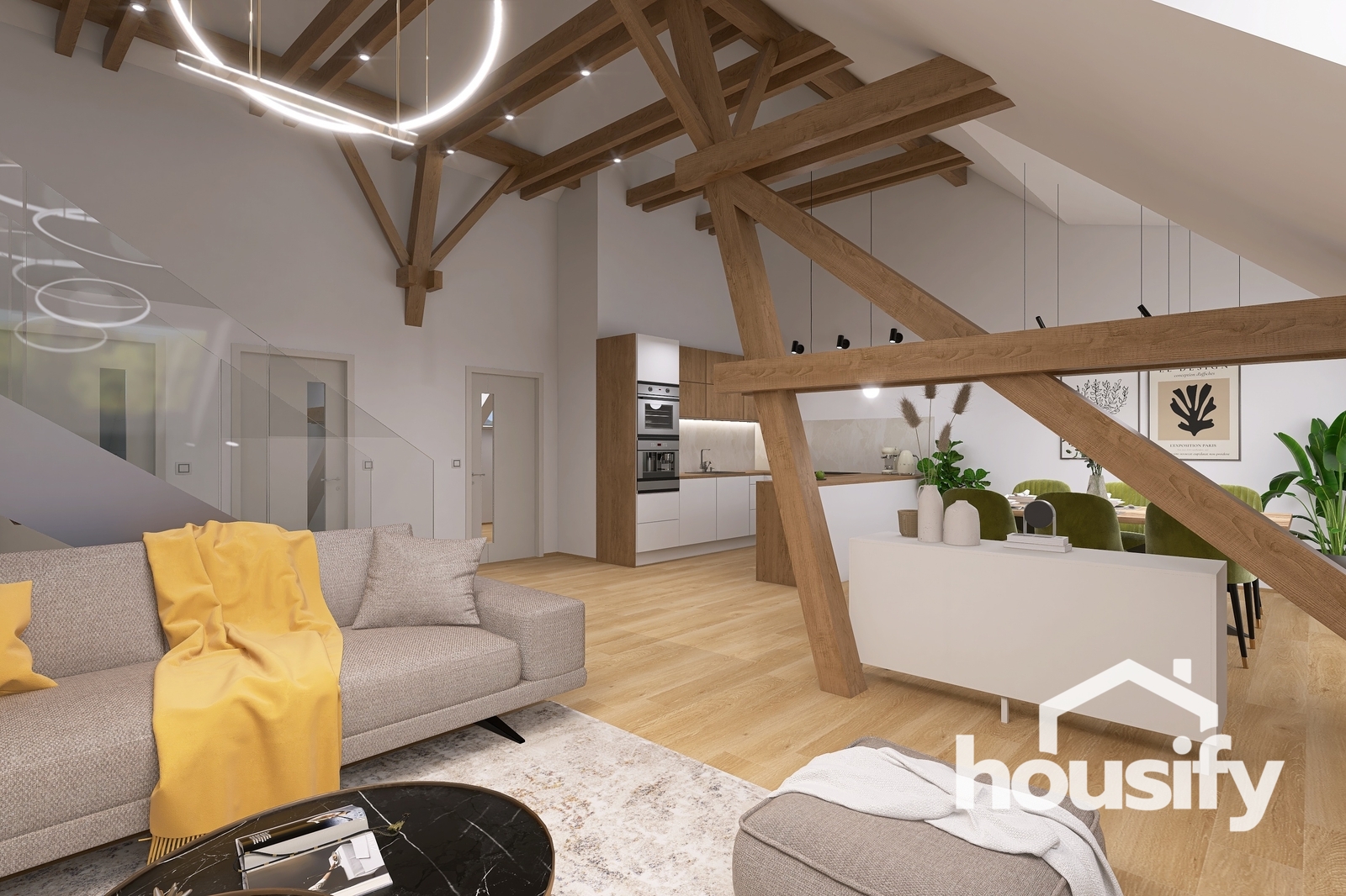Hlavní obytná část o rozloze 64 m² spojuje otevřený mezonet, obývací pokoj a kuchyňský kout. Výjimečnou atmosféru tohoto prostoru vytváří kombinace minimalistických detailů, industriálního kovového schodiště a hřejivosti přírodních materiálů, jako jsou dřevěné trámy. Pečlivé propojení těchto prvků dodává interiéru nezaměnitelný charakter. Další komfort zajistí tři samostatné ložnice a dvě koupelny s toaletou.