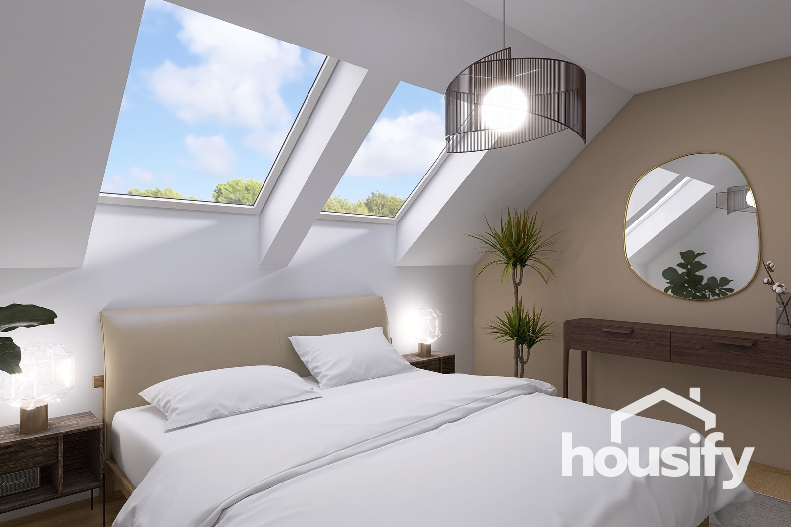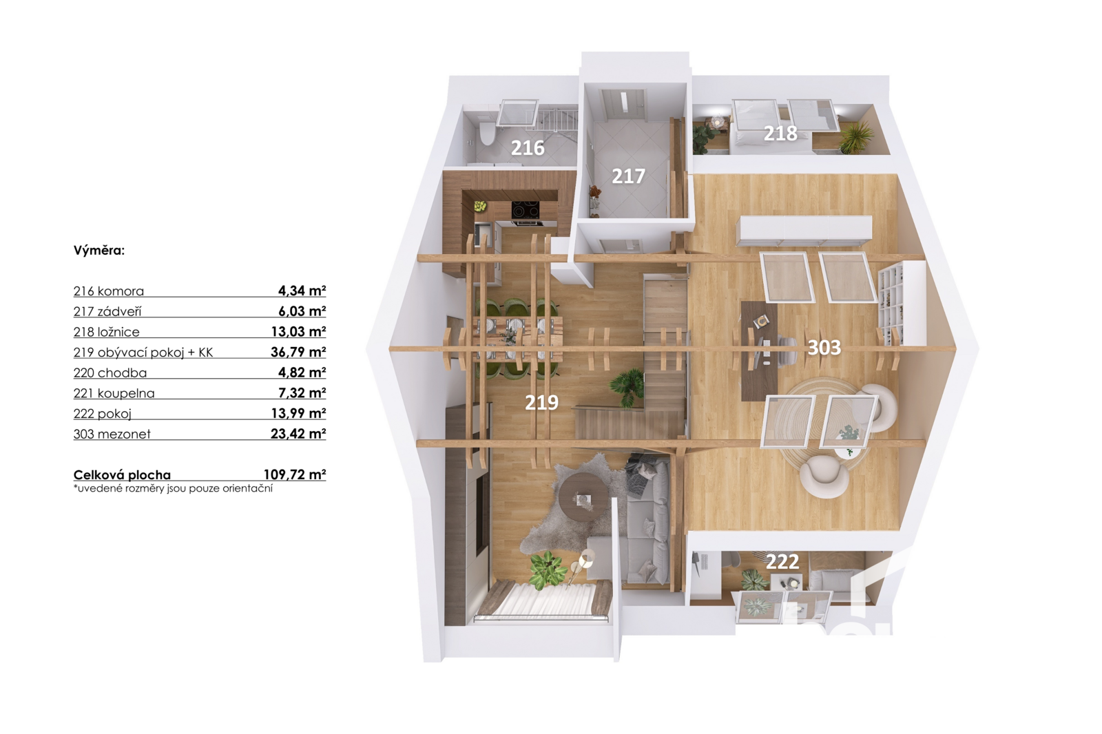 Hlavní obytná část o rozloze 64 m² spojuje otevřený mezonet, obývací pokoj a kuchyňský kout. Výjimečnou atmosféru tohoto prostoru vytváří kombinace minimalistických detailů, industriálního kovového schodiště a hřejivosti přírodních materiálů, jako jsou dřevěné trámy. Pečlivé propojení těchto prvků dodává interiéru nezaměnitelný charakter. Další komfort zajistí tři samostatné ložnice a dvě koupelny s toaletou.
